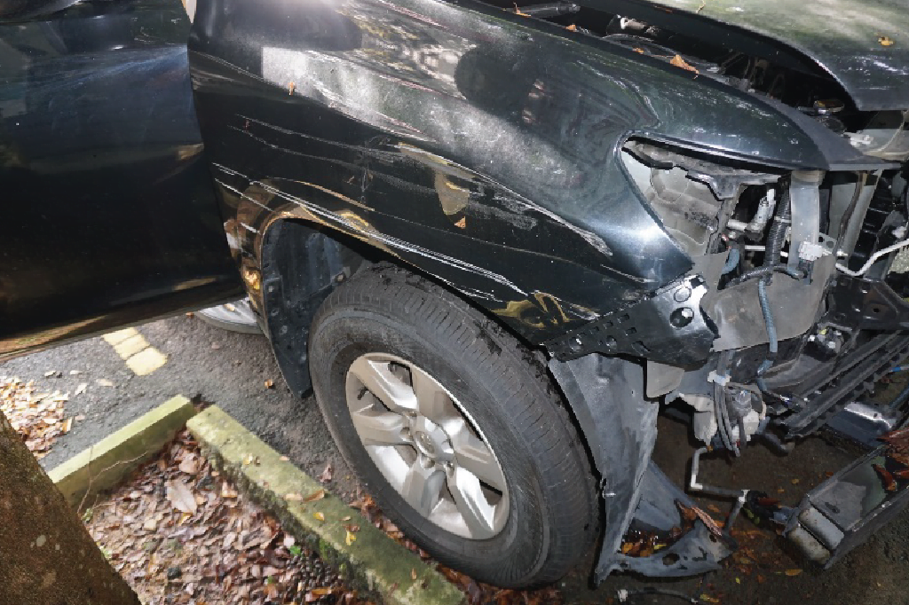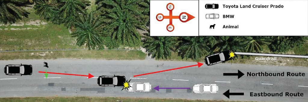 A collision between two (2) vehicles was reported to have occurred in Perak, Malaysia. Driver A, who was driving a black Toyota Land Cruiser Prado from Ayer Tawar to Taiping and while travelling along the Northbound route, saw an unknown animal, so he tried to avoid the animal but the Toyota Prado encroached into the opposite lane and hit the oncoming BMW, before the Toyota Prado swerved to the left hit the guardrail at the left side of the road.